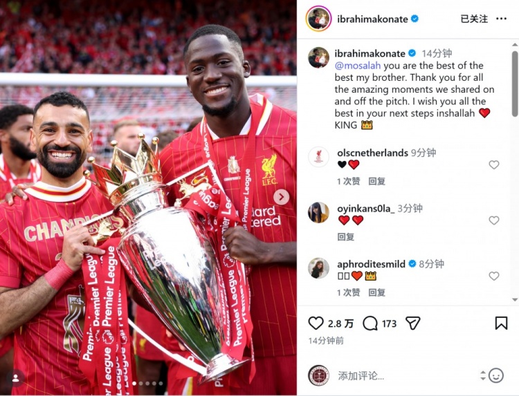 科纳特晒出与萨拉赫的捧杯合照,配文:“你是最佳中的最佳,我的兄弟。感谢你在场上场下与我共同度过的所有美妙时刻,祝你在未来的征程中一切顺利。”